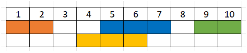 예를 들어 위 그림과 같이 [1,2] (주황색), [4,6] (노란색), [5, 7] (파란색), [9,10] (녹색) 주어졌다고 하자.