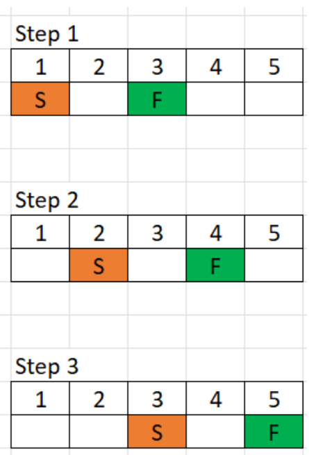 이때 두 개의 포인터 (first and second)을 만들어 first (F) 포인터를 second (S) 포인터보다 n 만큼 앞에 위치시킨다.